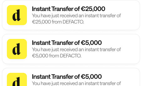 Defacto finances your cash flow needs on demand, with transfers in seconds.