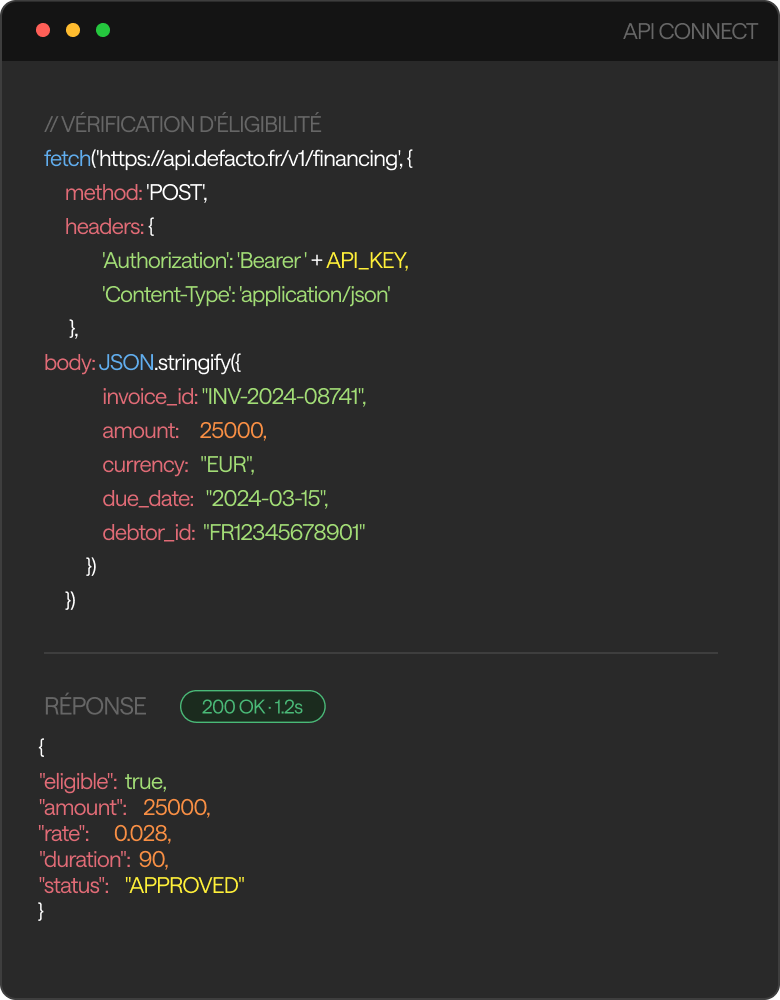 Native financing in your interface for daily use cases. Redirect to Defacto only when necessary. One model, zero compromise on experience. Our product is our API.